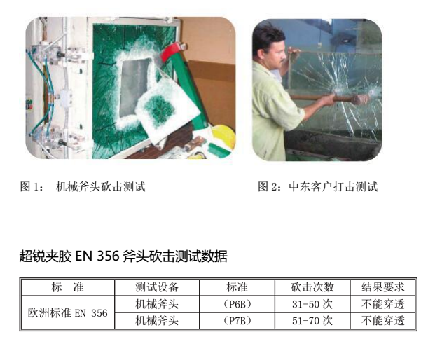 竊測(cè)試試用超銳夾膠UV-H型制成夾層玻璃的抗擊性能,用機(jī)械斧頭均勻砍擊夾層玻璃次數(shù)分別為31-50次和51-70次。兩種標(biāo)準(zhǔn)所能達(dá)到防盜竊和破門安全性能的不同級(jí)別的防護(hù)標(biāo)準(zhǔn)。(中國GB9962-1999國家標(biāo)準(zhǔn)沒有歐洲標(biāo)準(zhǔn)機(jī)械斧頭抗防盜的打擊標(biāo)準(zhǔn))。