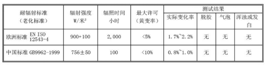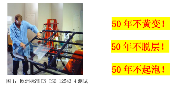 歐洲標準EN 12543-4模擬50年室外老化性、耐候性測試。用超銳夾膠制成的夾層玻璃通過高溫、耐濕、老化(輻射),測試夾層是否脫層、變色、產生氣泡等問題。